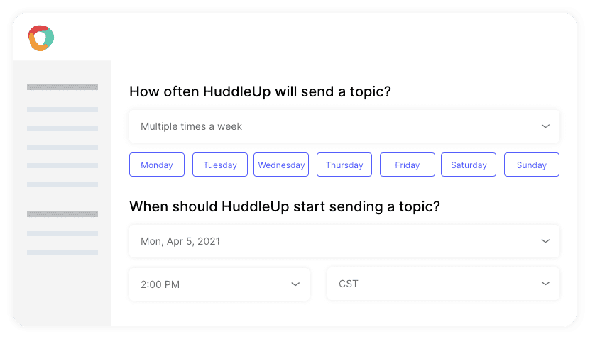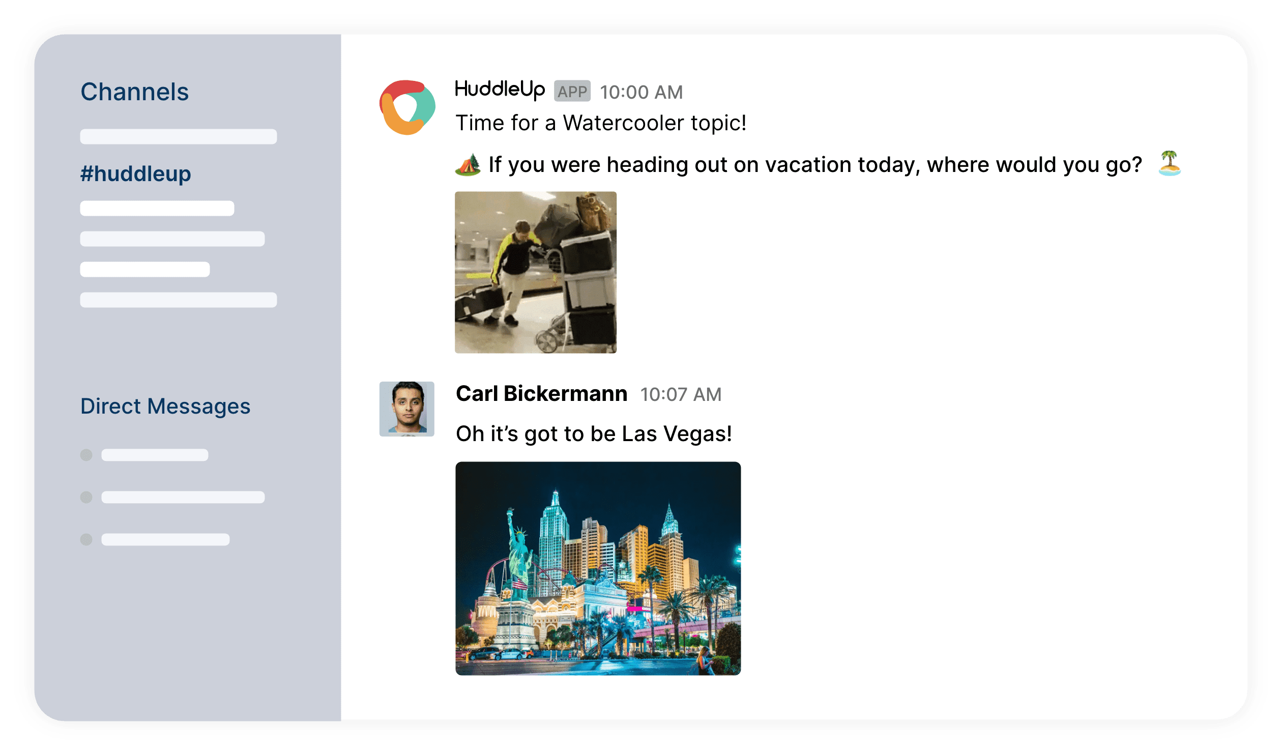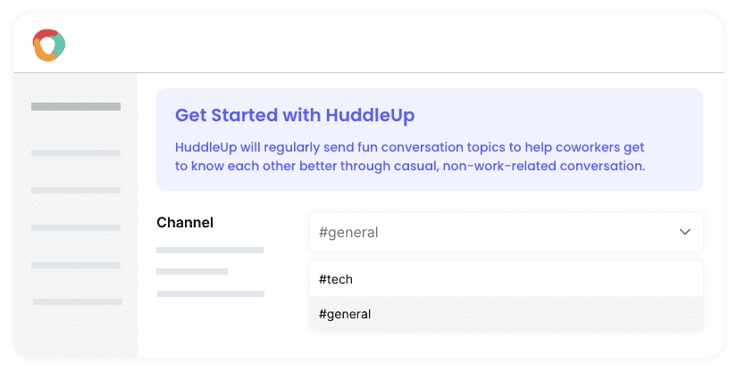 It's simple, you just have to add HuddleUp app to your workspace on Slack & add the channel where you want to start Watercooler chats & done. HuddleUp will be sending the Watercooler topic on that channel at your desired frequency to initiate conversations.